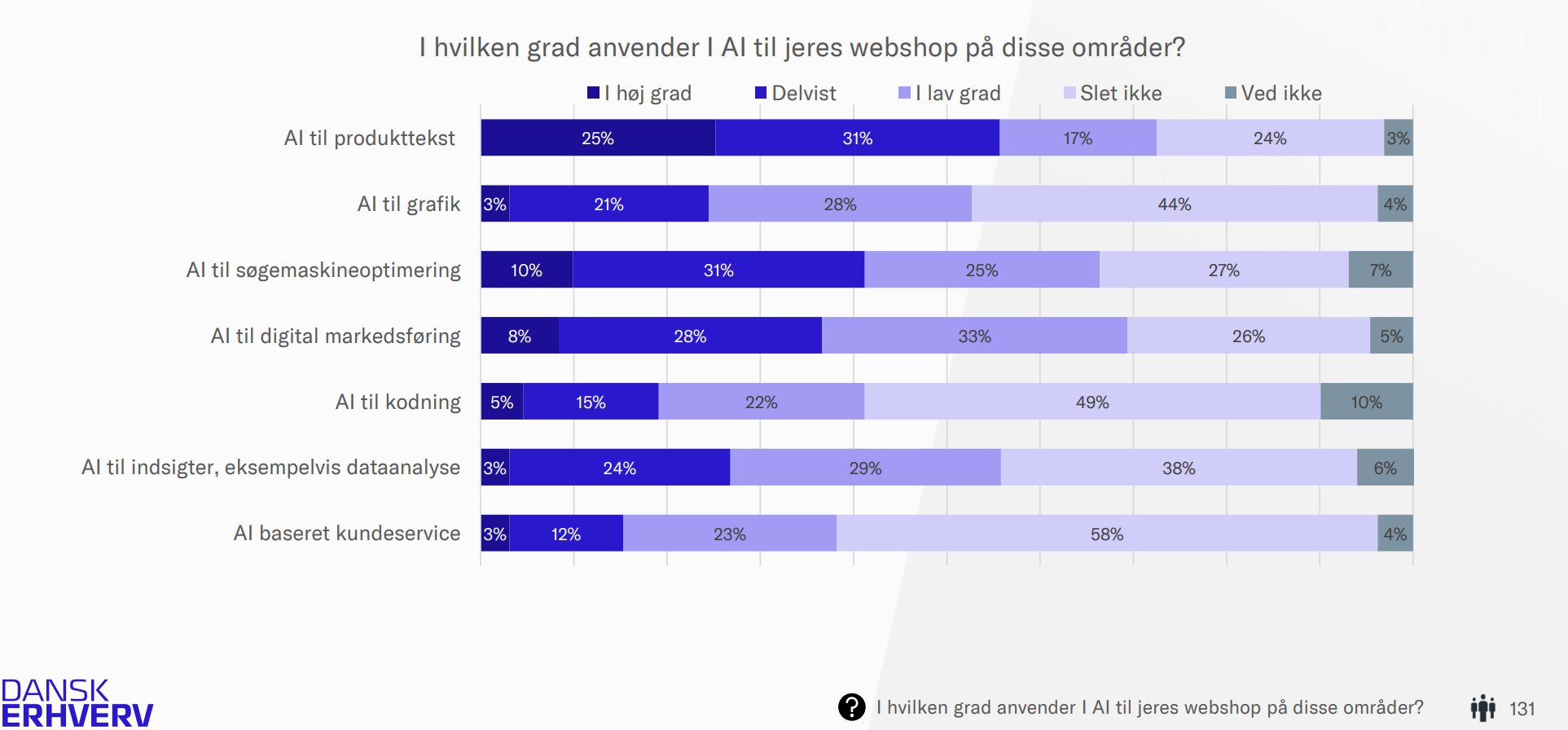 Atea er langt fra ene om at have taget AI til sig. I en medlemsundersøgelse fra Dansk Erhverv svarer mere end 7 ud af 10 netbutikker, at de enten bruger AI delvist eller i høj grad.