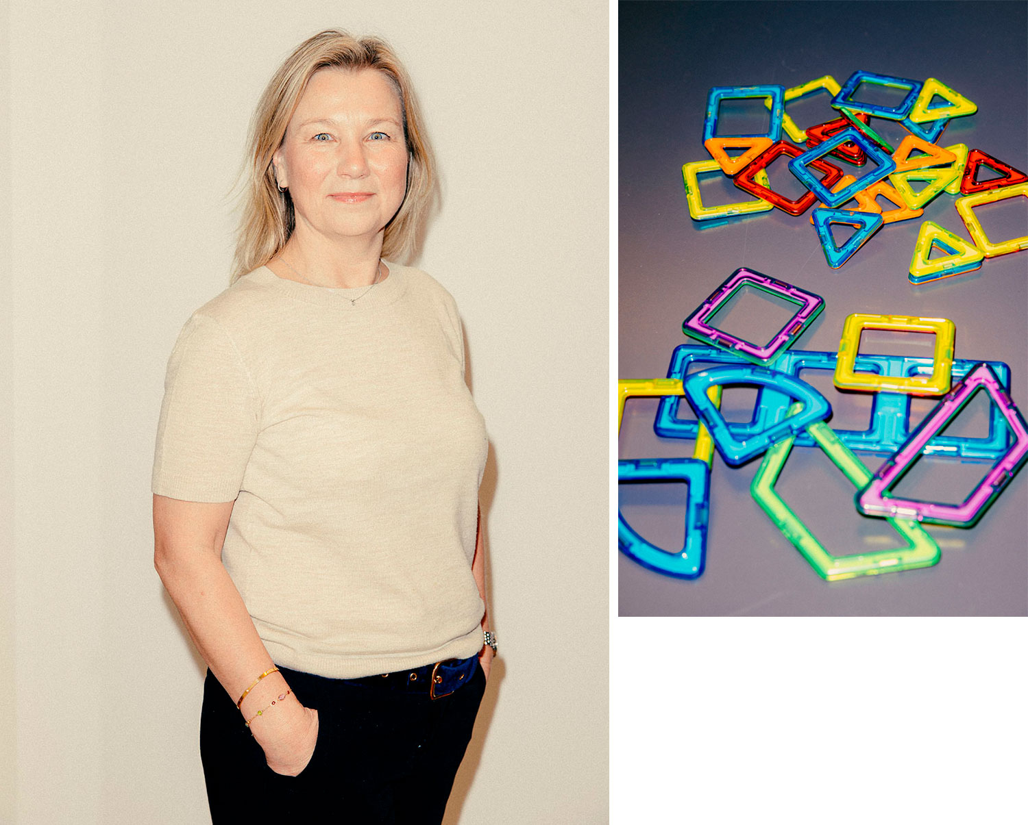 Tilbage i Hørsholm hiver Ann Riemer-Jeppesen og Jane Vestergaard et nyt produkt op på bordet. Det hedder Magna-Tiles og er et byggesæt af små tre- og firkantede stykker plastik i forskellige farver, der indeholder små magneter, så de kan sættes sammen. Også det kan man købe i en billig efterligning på Temu.