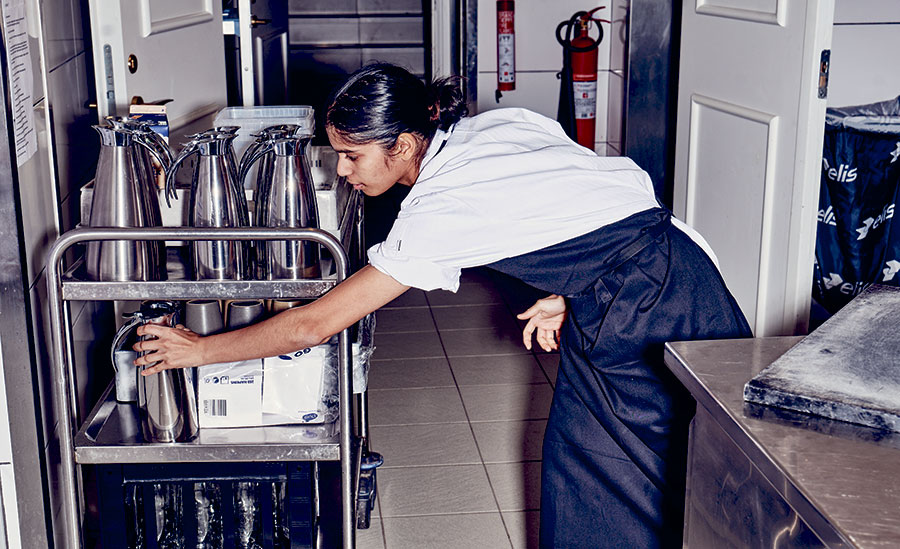 Det lå ellers ikke ligefrem i kortene, at 21-årige Laura Urmi Hjulmand skulle bevæge sig hjemmevant rundt i et travlt køkken og hygge sig med kollegaerne. Eller i det hele taget være en glad del af det danske arbejdsmarked.