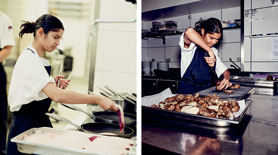”Jeg er glad for skolen, og så er det bare dejligt med et job, hvor jeg får lov at prøve en masse,” forklarer hun og peger på udviklingen af nye retter som noget af det sjoveste ved jobbet.