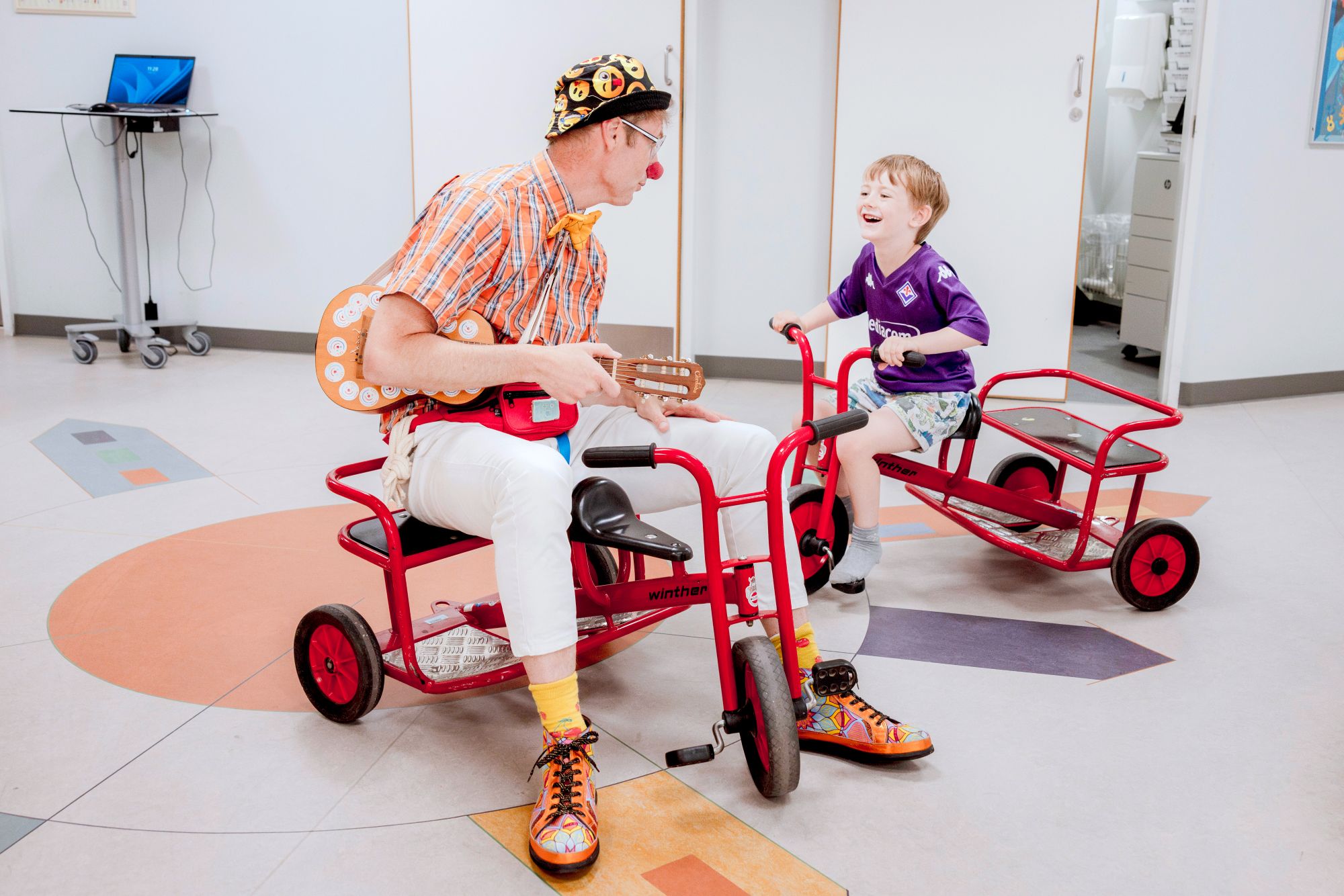 Sådan synger hospitalsklovnen Otto, mens han spiller guitar og kører på trehjulet cykel gennem børne- og ungeafdelingen på Sjællands Universitetshospital i Roskilde. Som en magnet tiltrækker han flere børn, der trofast følger trop.