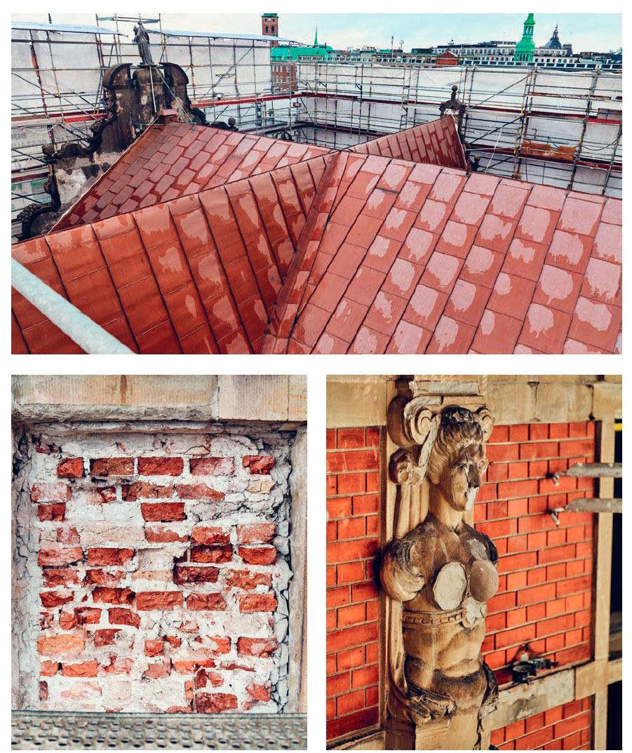 Her arbejder dygtige håndværkere med at udskifte det gamle kobbertag til et funklende nyt, der med tiden igen får sin kendte grønne farve. Men restaureringen af Københavns ikoniske børsbygning stopper ikke ved tagrenderne. Snart vil hele bygningens facade lyse op, når murværket bliver genoprettet i den oprindelige nederlandske renæssancestil, og bygningens mange figurer og ansigter i sandsten får nyt liv.