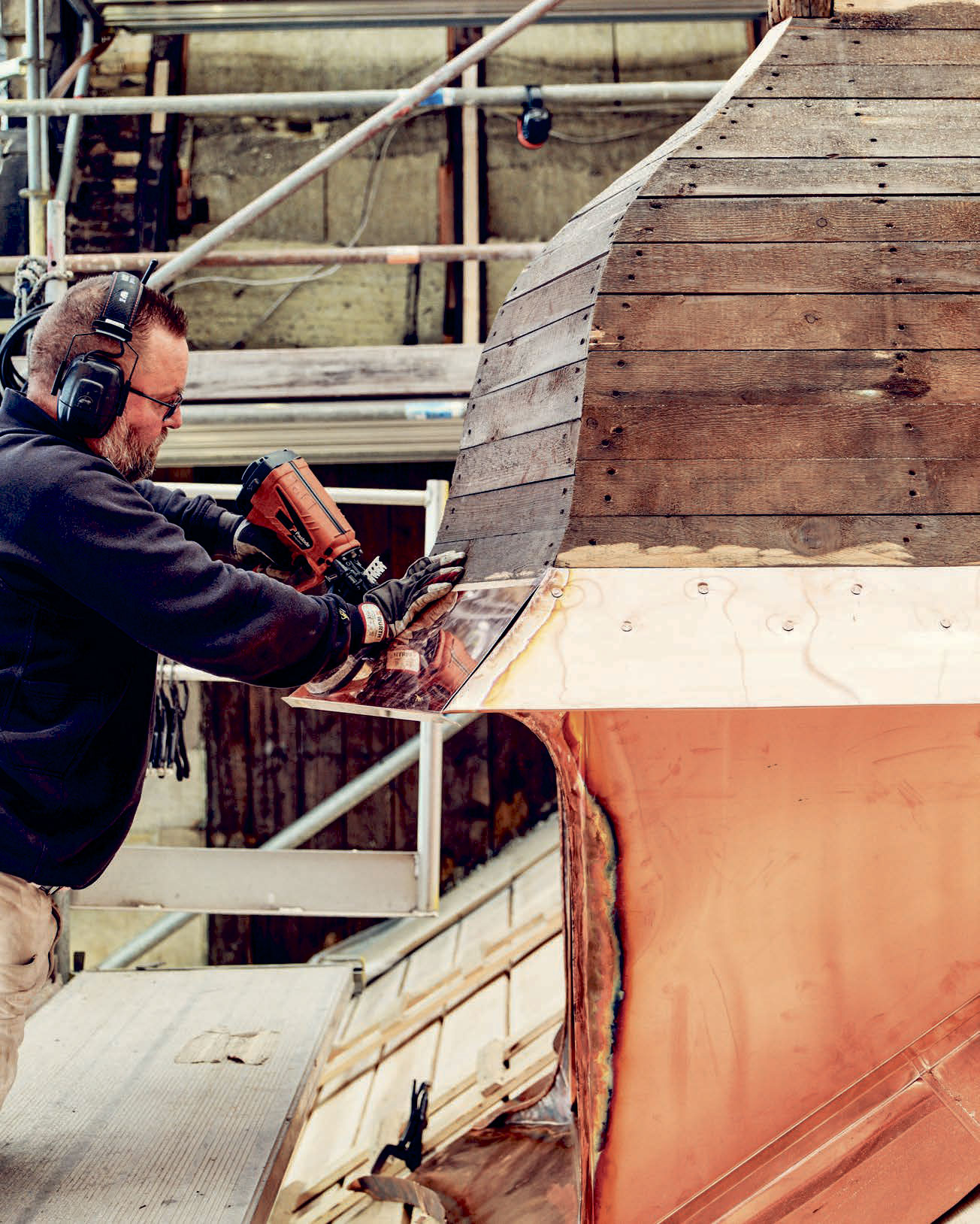 Ligesom det er vigtigt at værne om Børsen, er det vigtigt at værne om de evner, det kræver at restaurere sådan en bygning i Danmark. Derfor arbejder erfarne danske håndværkere sammen med lærlinge, der kan videreføre de klassiske håndværk. De dygtige håndværkere tilpasser det bløde kobber til Børsens mange fine profileringer.