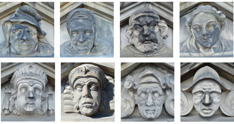 All the heads, masks, Herms and Caryatids on Børsen are different. But there are groups with various characteristic expressions. There is, for example, a difference between the original heads from 1624 and those which have since been replaced and reinterpreted in various styles. There are in all 204 Herms and Caryatid figures, 120 masked figures and 162 cornice figures.
