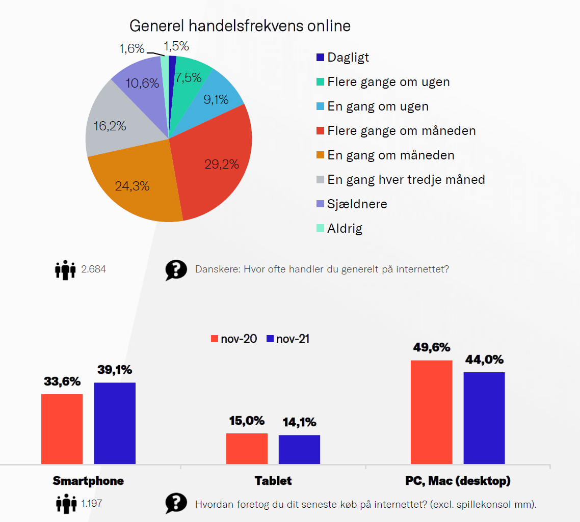 Smartphone bruges ved 39% af handlerne i november – godt 5,5%-point højere end november 2020. PC & Mac står for 44% og er stadig den mest anvendte enhed ved online køb.