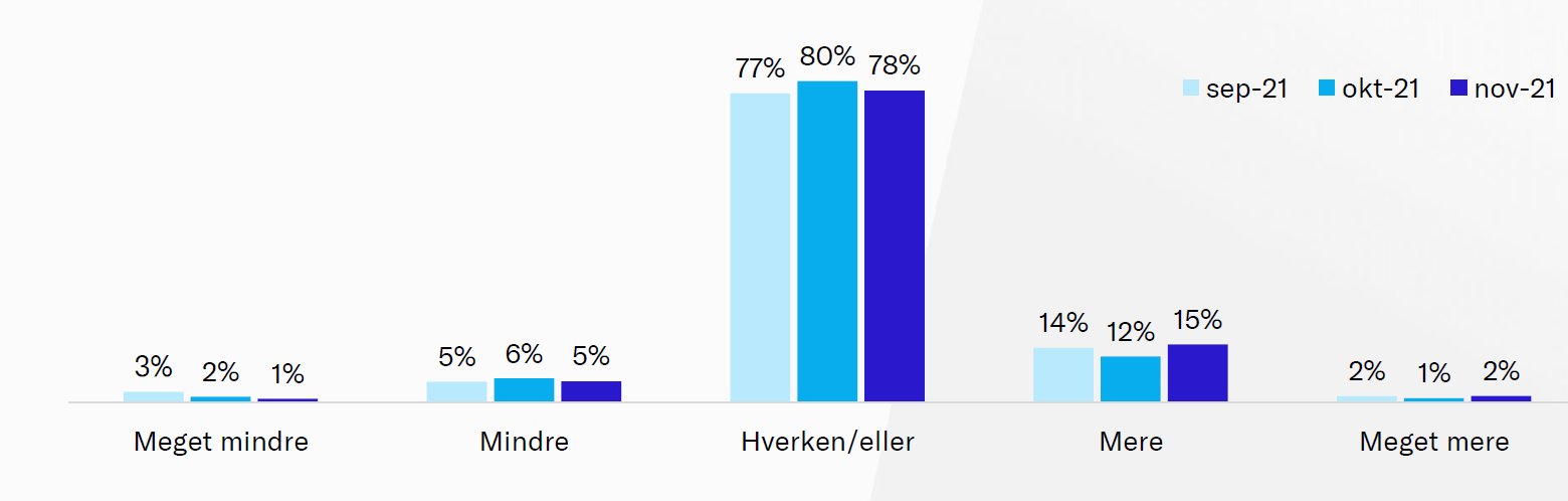 Andelen, der forventer at købe mere de næste 12 måneder, er på godt 16%, mens 6% forventer at købe mindre. Netto mener 10% dermed, at de vil e-handle mere de kommende 12 måneder, end de har gjort de seneste 12. 26% mener desuden, at de har handlet mere online de seneste 12 måneder sammenlignet med tidligere (netto positive).