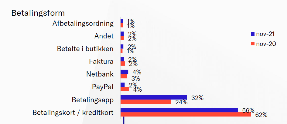 Lidt mere end halvdelen af betalingerne (56%) blev i november klaret med et betalingskort. Betalinger via app stod for 32% af transaktionerne, svarende til en stigning på 8%-point ift. november 2020.