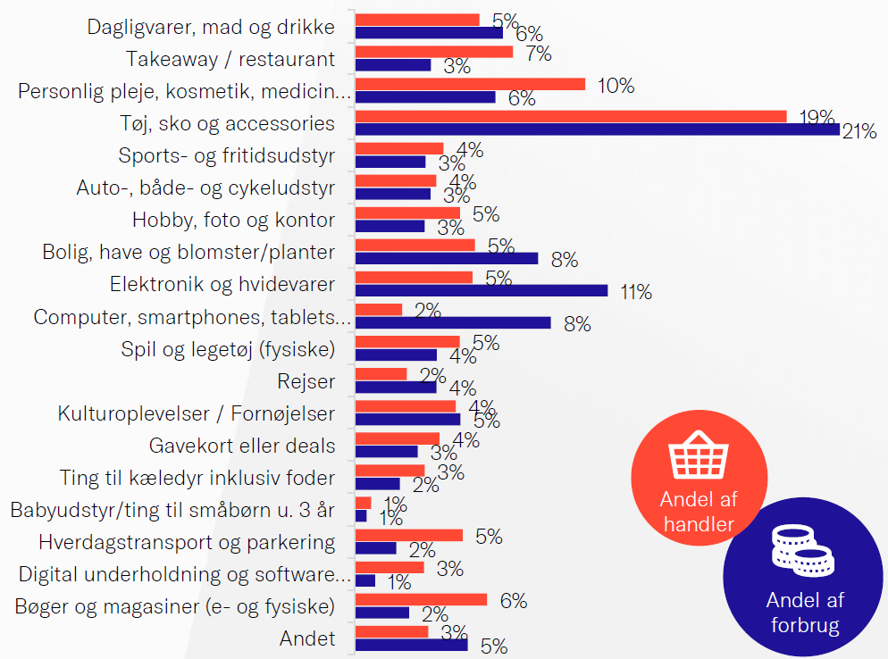 Tøj, sko og smykker er den klart største kategori i november, både målt på andel af handler og andel af forbrug. Rejser når blot 4% og er fortsat på et markant lavere niveau, end kategorien havde før corona.