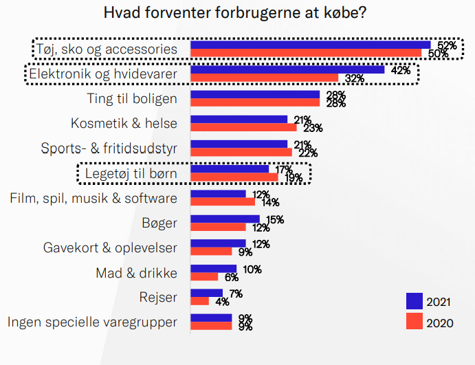 En stor del af årets forbrug vil lande i tøjbutikkerne – ganske som det plejer. Halvdelen af forbrugerne forventer at købe tøj, sko og accessories, mens 4 ud af 10 vil putte elektronik og hvidevarer i kurvene. Tallene afspejler, at der bliver købt en del julegaver til Black Week, forklarer Niels Ralund, som hæfter sig ved, at forbrugerne regner med at købe i flere forskellige varekategorier.