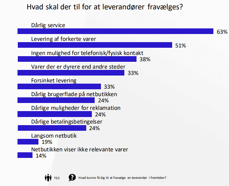Den primære årsag til at vælge en leverandør fra er dog ”dårlige service”, der blandt andet dækker over lang leveringstid, lang ventetid på svar og generel manglende kommunikation.