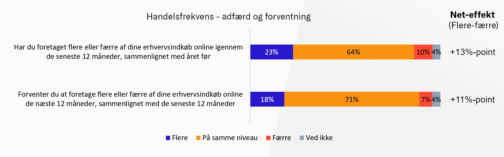 ”Sidste analyse blev lavet under coronakrisen, som virkelig fik de digitale indkøb til at eksplodere. Nu er vi tilbage til en mere normal hverdag, men 3 ud af 4 indkøbere anvender stadig oftest nettet, når de skal handle. Det er bemærkelsesværdigt, at der ikke sker et større fald, og derfor er konklusionen, at erhvervsindkøberne virkelig har bidt sig fast på nettet,” siger Simon Bjerremann.