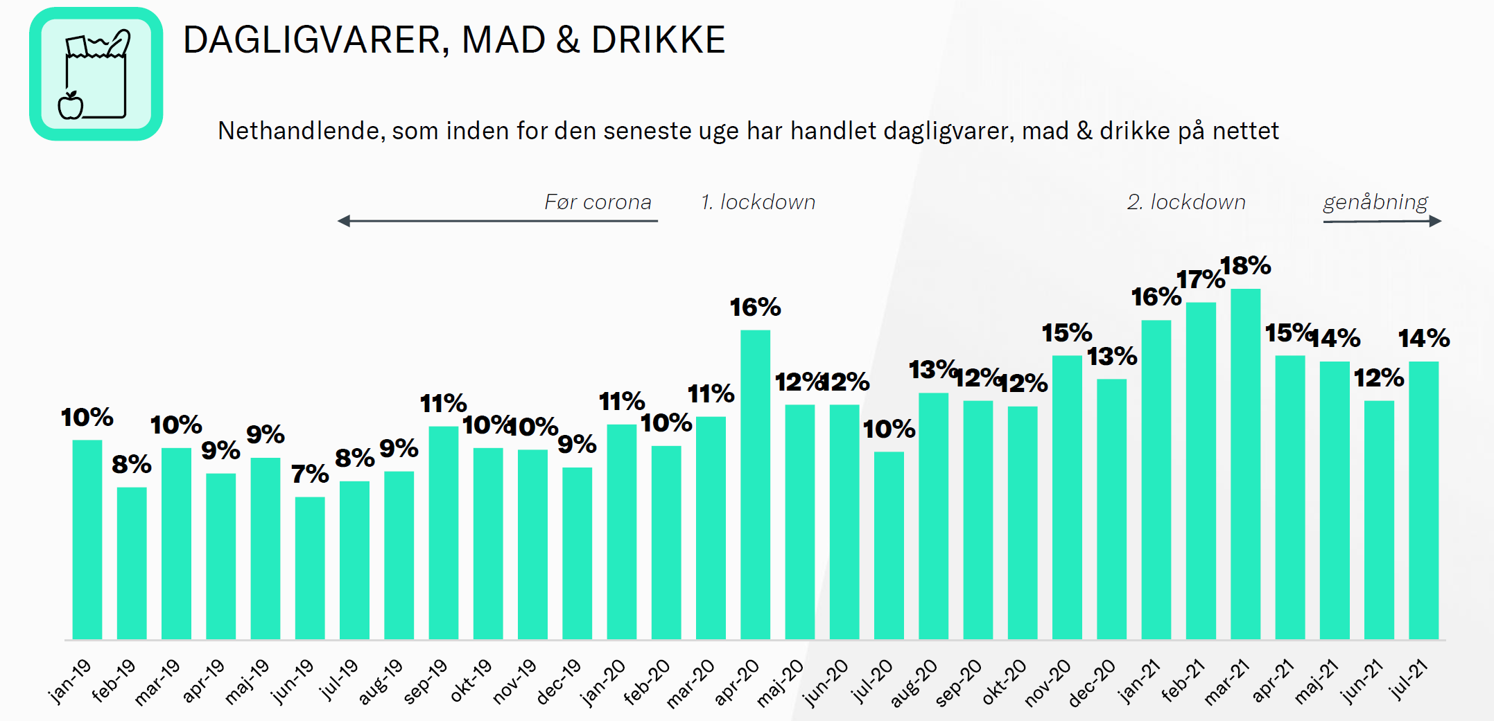 De primære årsager til e-handel er typisk bekvemmelighed, pris og udvalg. Normalt angiver cirka 5 % af forbrugerne, at de e-handler af andre årsager, men i første halvår af 2021 var det tal fordoblet. 2 ud af 3 af disse forbrugere angav corona-relaterede årsager til, at de har handlet på nettet.
