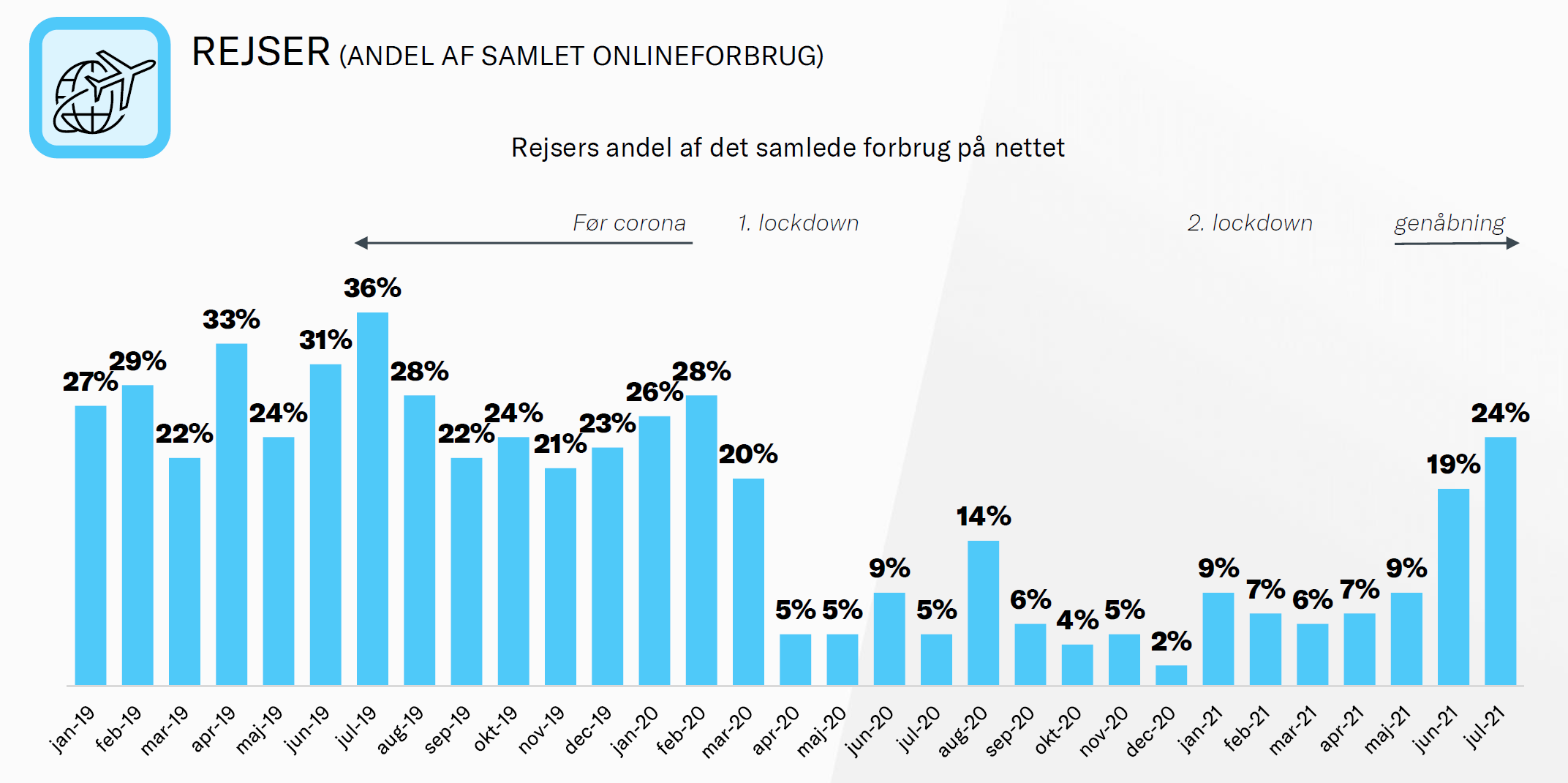 En af de hårdest ramte brancher er som nævnt rejsebranchen, som tidligere typisk udgjorde over 25% af det samlede e-handelsforbrug. Under krisen har kategorien dog i flere måneder været helt nede på at udgøre under 5 % af det samlede e-handelsforbrug.