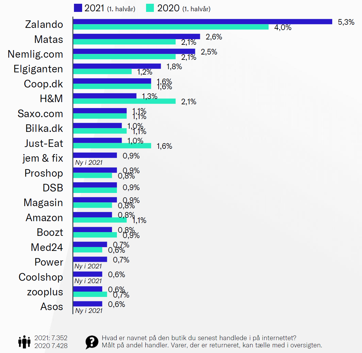 Udviklingen afspejler sig også på listen over de 20 mest benyttede netbutikker. Den toppes stadig af tyske Zalando, men flere danske butikker går frem, og andre debuterer på listen – eksempelvis tordner Jem & Fix ind på tiendepladsen.