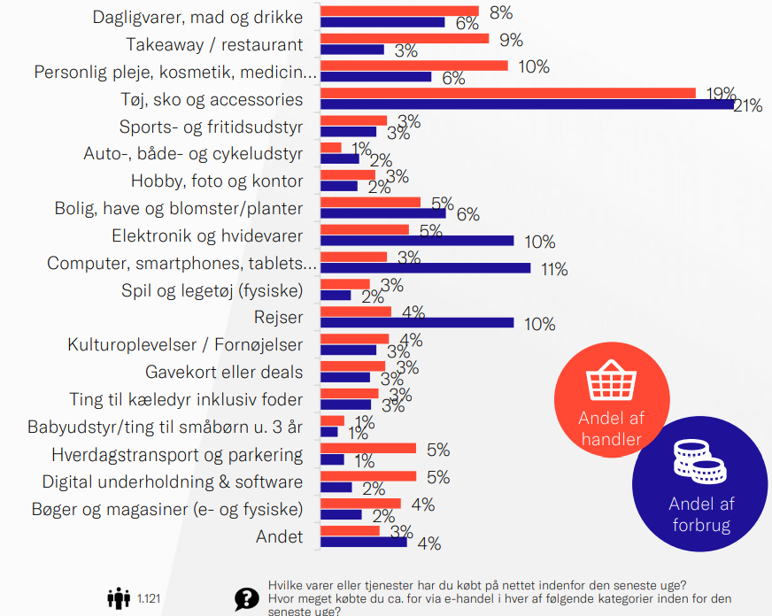 I januar var tøj, sko og accessories igen den største varegruppe både hvad angår andel af handler og forbrug. Dagligvarer, mad og drikke nåede seks procent af forbruget, hvilket er en lavere andel end i januar 2021. Det er dog en kategori, som forbrugerne generelt forventer at handle mere af online.