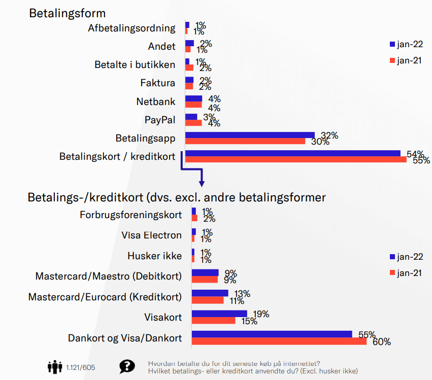 Godt halvdelen (54 procent) af betalingerne blev gennemført med et betalingskort, marginalt mindre end januar 2021. Betalinger via app stod for 32 procent af transaktionerne, svarende til en stigning på 2%-point ift. januar 2021.