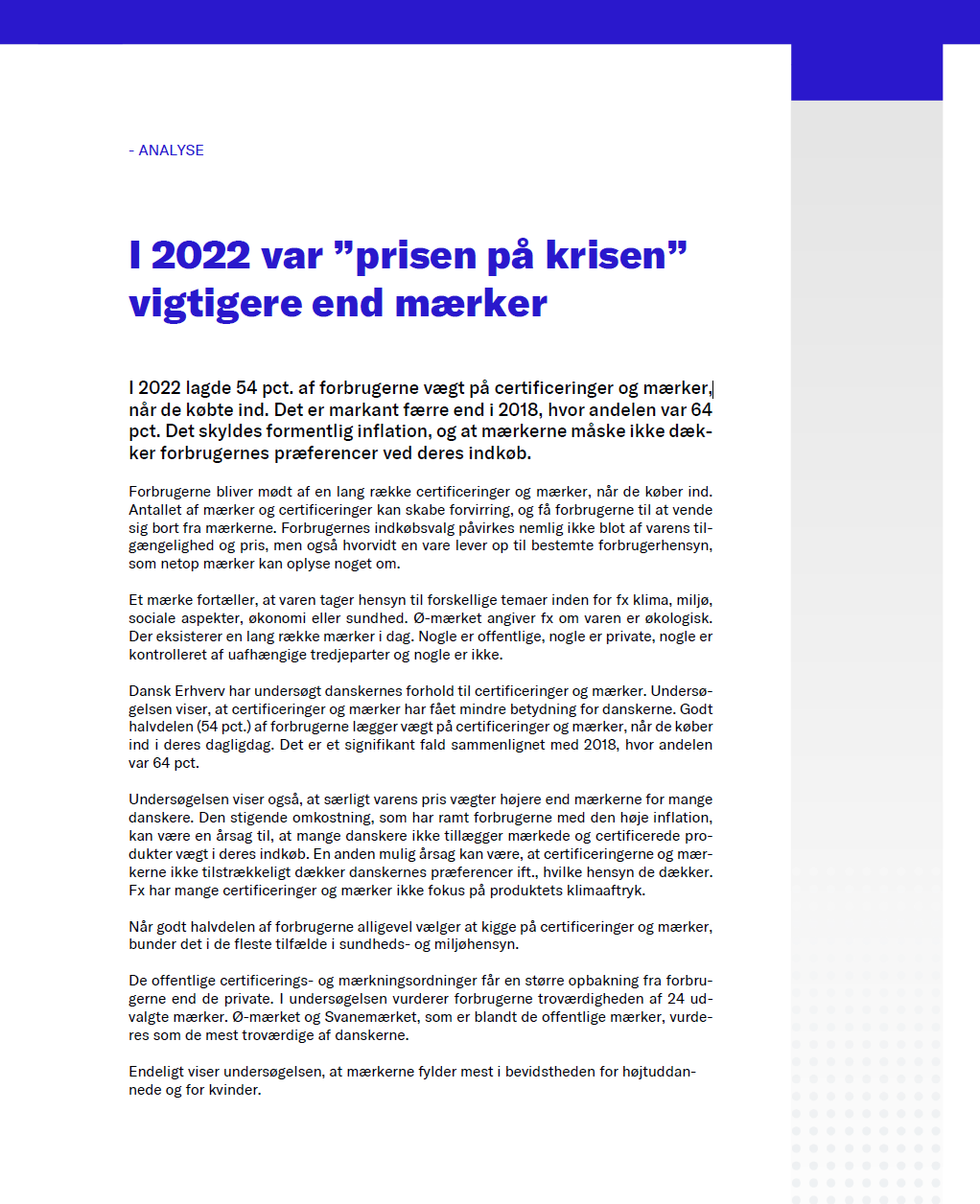 I 2022 lagde 54 pct. af forbrugerne vægt på certificeringer og mærker, når de købte ind. Det er markant færre end i 2018, hvor andelen var 64 pct. Det skyld...