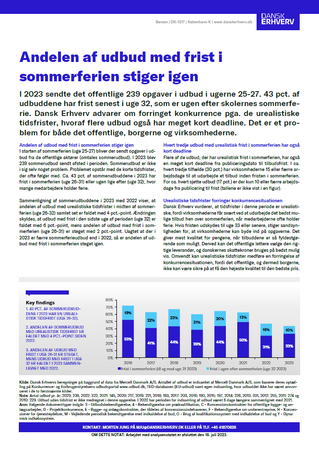 I 2023 sendte det offentlige 239 opgaver i udbud i ugerne 25-27. 43 pct. af udbuddene har frist senest i uge 32, som er ugen efter skolernes sommerferie. D...