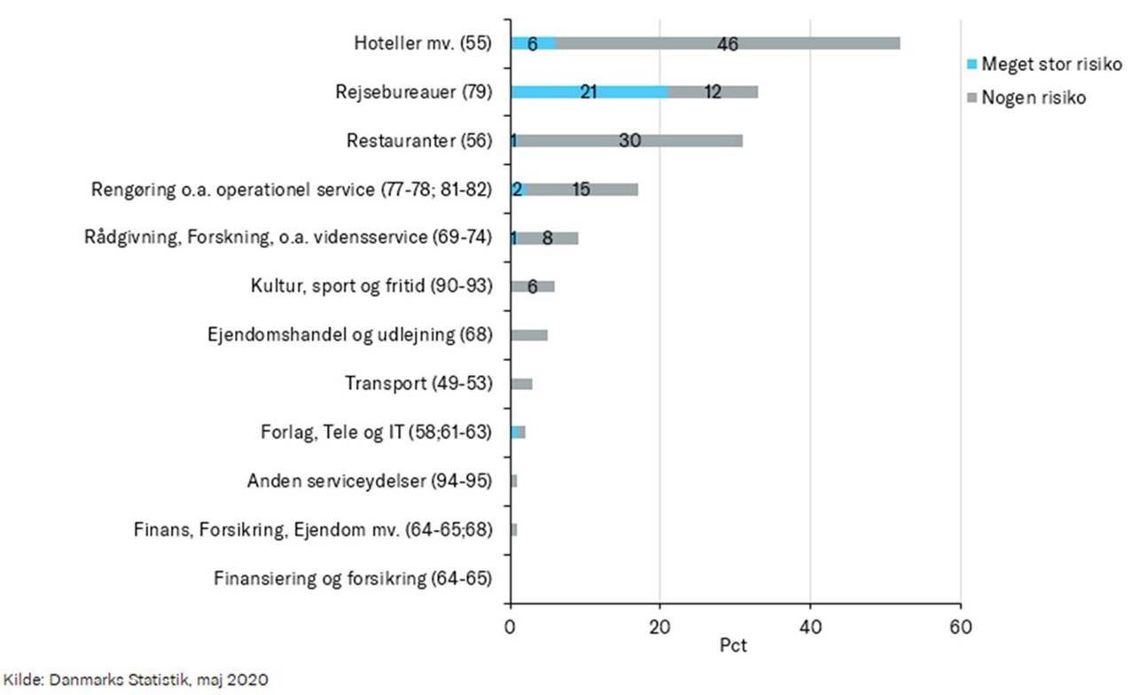 Dansk Erhverv ser med stor bekymring på de nye tal og estimerer, at der kan stå op til 26.000 årsværk på spil, hvis de i alt 5.000 restauranter, hoteller og rejsebureaer, der vurderer nogen eller meget stor risiko for afvikling indenfor de næste tre måneder, ender med at knække nakken.
