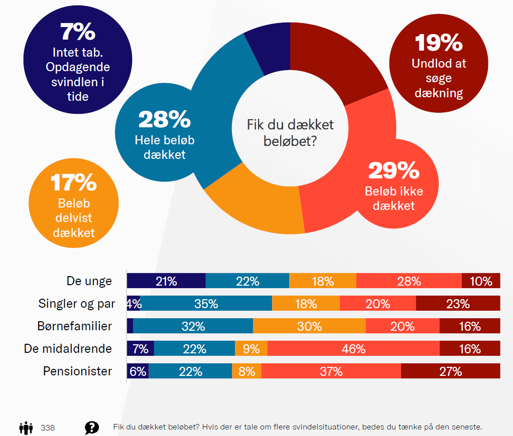 Skulle man som forbruger være så uheldig at ramme ind i en fupbutik, kan man trøste sig med, at der er gode muligheder for at få sit eventuelle tab dækket. Det bekræfter analysen – 28 % fik hele deres tab dækket, og 17 % fik tabet delvist dækket. Dertil opdagede 7% svindlen, før det kom til et tab.