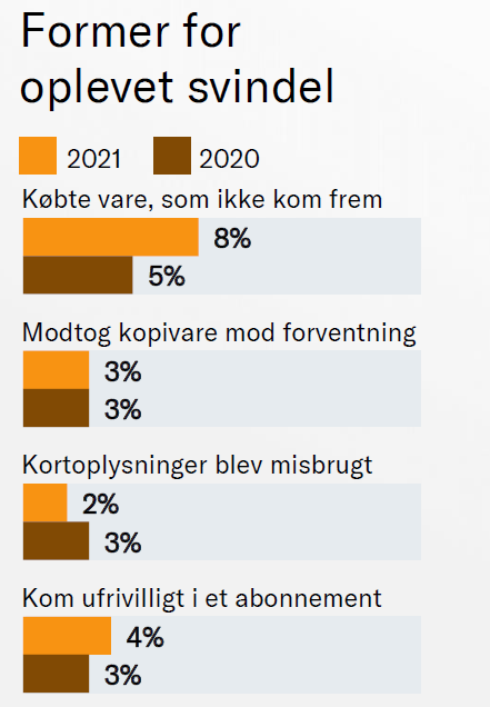 Det er især manglende produkter og kopivarer, som forbrugerne rammes af, hvis de er så uheldige at blive svindlet online. Til gengæld er der få tilfælde af svindel med kortoplysninger – altså hvor kortoplysninger bliver stjålet eller på anden vis misbrugt.