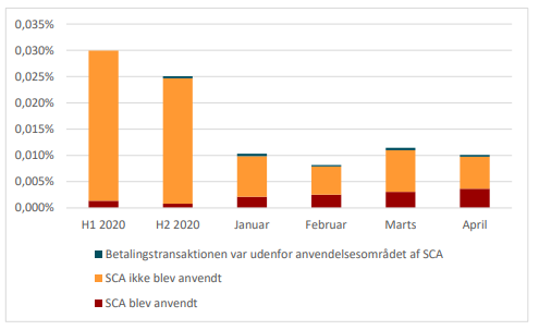 Tallene viser, at andelen af svigagtige transaktioner er faldet markant, efter at SCA er blevet rullet bredt ud i januar 2021. De svigagtige kortbetalinger på internettet er faldet fra 0,03 pct. af alle transaktioner i første halvår af 2020 og 0,025 pct. i andet halvår 2020 til omkring 0,01 pct. i perioden fra januar til april 2021. Det er et fald i misbruget på to tredjedele siden første halvår af 2020.