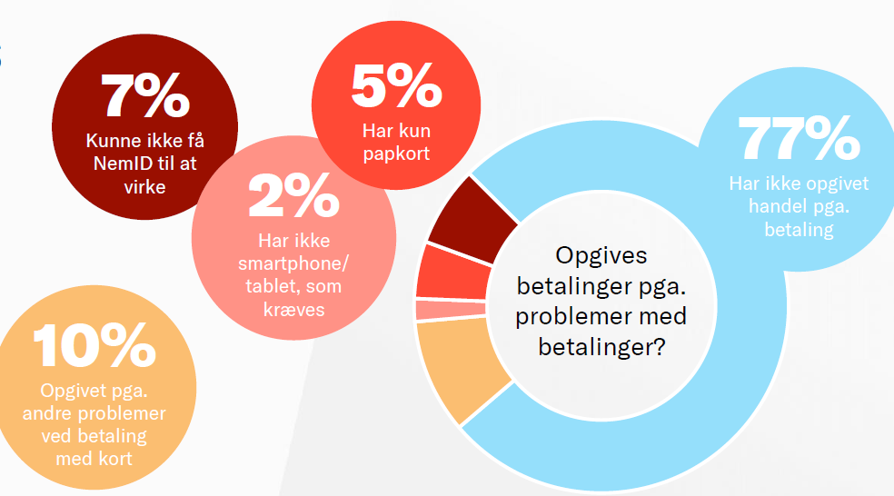 Hos den fjerdedel af kunderne (23%), hvor betalinger måtte opgives, svinger problemerne fra ikke at have smartphone (2%) over kun at have NemID nøgle-papkort (5%) til ikke at kunne få NemID til at virke (7%) til andre problemer med betalingskort (10%).