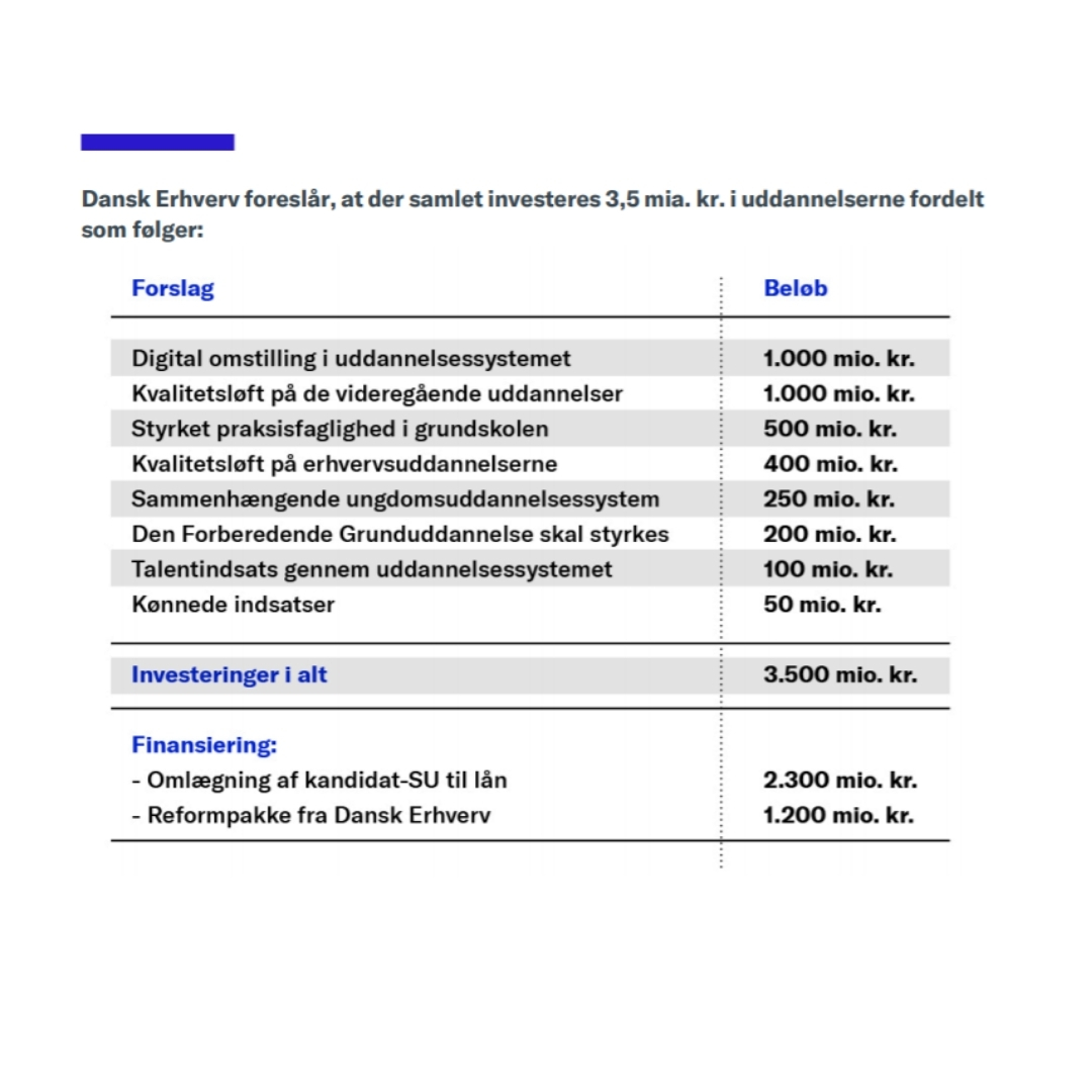 Dansk Erhverv foreslår at omlægge SU’en på kandidatdelen af universitetsuddannelser til lån, det vil frigive 2,3 mia. kr. årligt. Dertil foreslår Dansk Erhverv initiativer for yderligere 1,2 mia. kr. så der samlet investeres 3,5 mia. kr. om året direkte i de forskellige dele af uddannelsessektoren, hvor der er et stort behov for dette.