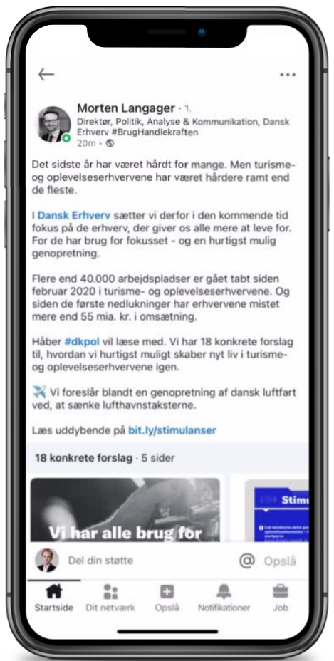 ”Hoteller, restauranter, luftfarten, rejsebureauer, feriehuse, natteliv og kulturen – ja alle turisme- og oplevelseserhvervene i Danmark. De er banket helt ned under gulvbrædderne. Mange af dem har blodrøde tal på bundlinjen i øjeblikket og tusindvis af job er gået tabt. Derfor foreslår vi at stimulere aktiviteten i de hårdeste ramte erhverv, straks genåbningen tillader det. Vi vil sikre de bedst mulige betingelser for en hurtigst mulig genopretning af omsætningen. Vi skal genskabe tusindvis af job,” siger adm. direktør i Dansk Erhverv, Brian Mikkelsen og uddyber: