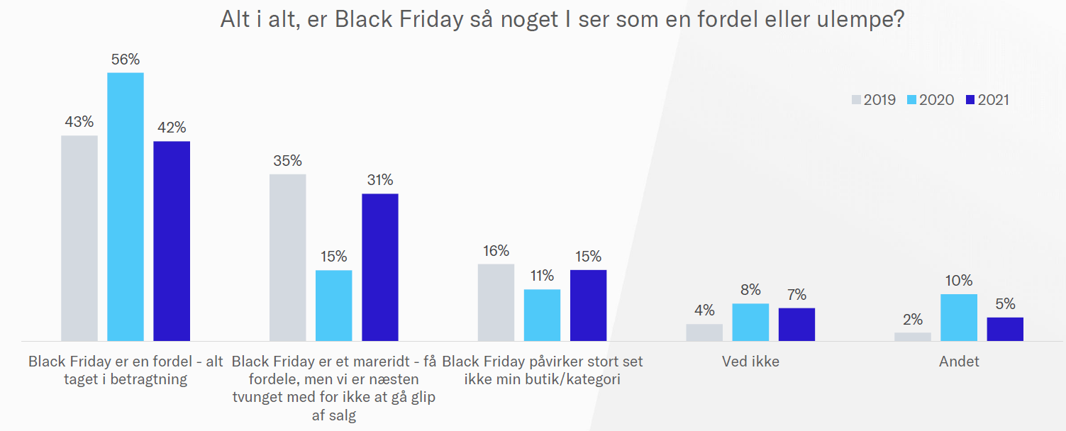 I år er der dog også sket et ryk, når vi ser på, om netbutikkerne faktisk er glade for Black Friday. Det er 4 ud af 10, men knap hver tredje mener, at Black Friday er “et mareridt, som man nødvendigvis må deltage i.” Det er en markant stigning fra sidste år, men set over en længere periode er tallet nogenlunde stabilt.