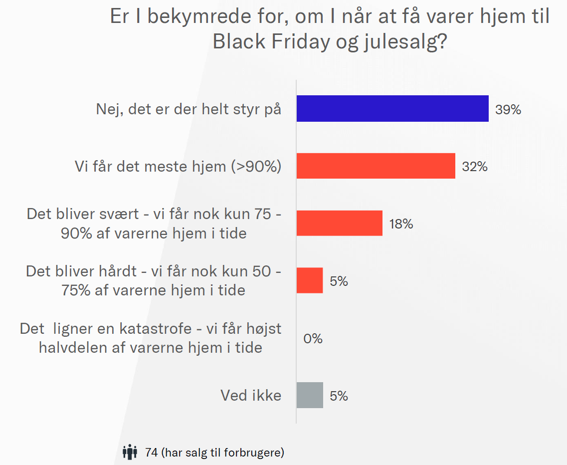 ”Der er heldigvis ingen, der svarer, at varemanglen er katastrofal, og det er også blot 5 %, der vurderer, at de kun vil få 50 til 75 % af varerne hjem i tide. Så ja, der er mangel i enkelte brancher på enkelte varer, men rygterne om forsyningskædens død er stærkt overdrevne, og i langt de fleste butikker er der varer på hylderne inden den travle tid.”