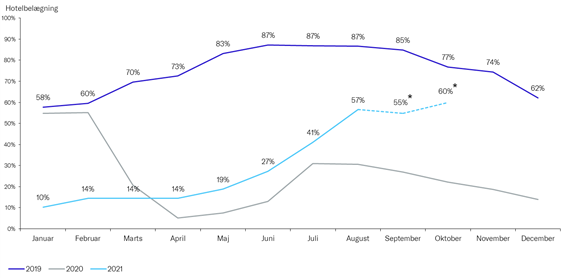 Oktober står til at blive den bedste måned i mere end halvandet år for de københavnske hoteller, målt på hotelbelægningen. Foreløbige tal, som Dansk Erhverv har adgang til via sine hotelmedlemmer, viser, at de københavnske hoteller har haft en belægning på 60 pct. i gennemsnit i oktober indtil nu. Det er den højeste belægningsprocent registreret i år – og det er en markant forbedring i forhold til oktober sidste år, hvor belægningen lå på ca. 20 pct. Fremgangen i København glæder Dansk Erhverv, der fremhæver, at det vil have stor betydning for hele turismens værdikæde:
