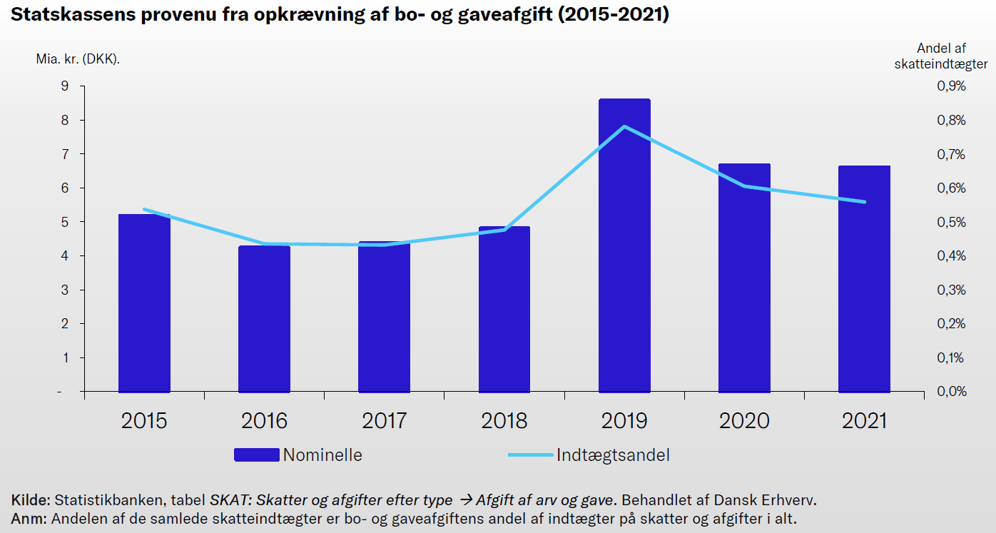 Provenuet fra opkrævning af bo- og gaveafgiften (populært arveafgiften) er netop blevet opgjort af Danmarks Statistik. Det står derfor klart at statskassen fik 59 mio. kroner mindre ind på opkrævning af bo- og gaveafgift hos borgere og virksomheder i 2021 end i 2020. Ligeledes viser det sig at afgiftens samlede betydning for skatteopkrævningen blev reduceret med 8 pct. fra i 2020 at udgøre 0,60 pct. af statens indtægter til i 2021 kun at udgøre 0,56 pct. af statens indtægter, svarende til lidt over 6,6 mia. kr.