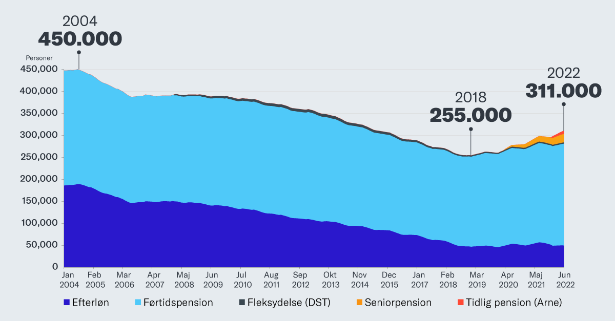 Ud over folkepensionen er der i øjeblikket fem tilbagetrækningsordninger på arbejdsmarkedet: Førtidspension, seniorpension, efterløn, ret til tidlig pension og fleksydelse. I 2004 var der 450.000 danskere, der havde trukket sig tilbage fra arbejdsmarkedet inden folkepensionsalderen. Reformer af bl.a. efterlønnen og førtidspensionen har bidraget til at reducere det til 255.000 i slutningen af 2018. Et fald på knap 200.000. Men siden 2018 er kurven desværre knækket.
