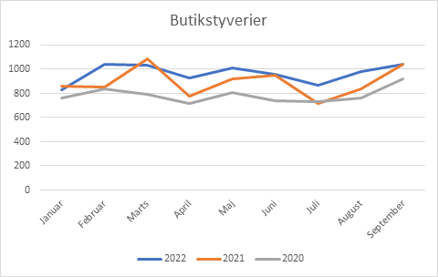 I tredje kvartal blev der i Crimestat registreret 2890 butikstyverier. Det er helt på niveau med årets to første kvartaler, og markant højere end sidste år. Der er således sket en stigning på 11 % i registrerede butikstyverier sammenlignet med samme periode sidste år. Det samlede antal tyverier i årets tre første kvartaler lå på 8697, hvilket er en stigning på 8 % siden 2021 og 22 % sammenlignet med 2020 (tallet for 2020 må dog formodes at være påvirket af corona-nedlukninger). Alle tre måneder i tredje kvartal lå enten højere eller på niveau med de samme måneder sidste år.