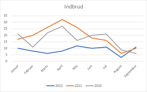 Tallene for indbrud registret i Crimestat viser, at 2022 generelt ligger markant lavere end de to foregående år. Tredje kvartal viser et lille fald siden andet kvartal, og vi ligger nu ca. på niveau med første kvartal i år. I august er der kun registeret tre indbrud, mens der i både september og juli blev registreret 11.
