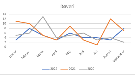 Antallet af registrerede røverier i Crimestat ligger fortsat relativt lavt, så det er svært at konkludere noget endegyldigt ud fra disse tal. Tallene for tredje kvartal ligger nogenlunde på niveau med resten af året og lavere end sidste år.