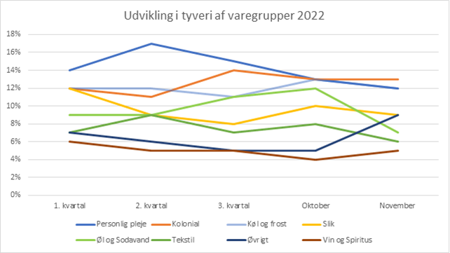 Top-10 over oftest stjålne varer har et par interessante ændringer. Kolonial er steget med tre procentpoint og dette kan højst sandsynligt kobles sammen med inflationen og den økonomiske krise, der især påvirker de fattigste borgere. Sammenholdt med at slik og tekstil er faldet med hhv. to og fire procentpoint tegnes der et billede af, at det i højere grad er basisvarer der bliver stjålet. Det er de varer, folk har brug for uanset hvad, og hvis pengene ikke rækker, kan nogle føle sig nødsaget til tyveri af disse varegrupper.