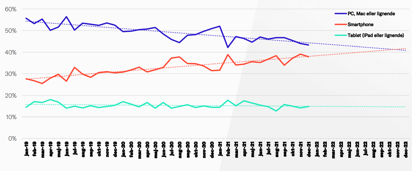 “Det er en lidt mindre andel, end da vi spurgte til forventningerne i 2021, men omvendt er det kun otte procent, der forventer at skrue ned for forbruget. Samtidig forventer vi, at salget af rejser vil vende tilbage, og dermed er der god grund til at tro på, at forbruget på nettet vil vokse igen i 2022,” slutter Niels Ralund.