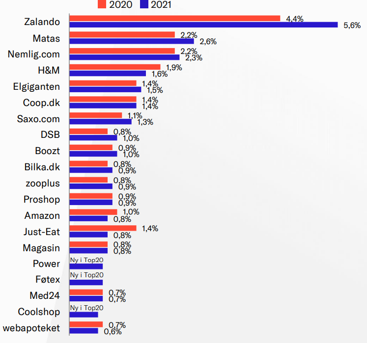 Fremgangen viser sig også på listen over de 20 mest benyttede netbutikker i Danmark. Den toppes igen suverænt af tyske Zalando, som dog kun har selskab af tre andre udenlandske netbutikker.
