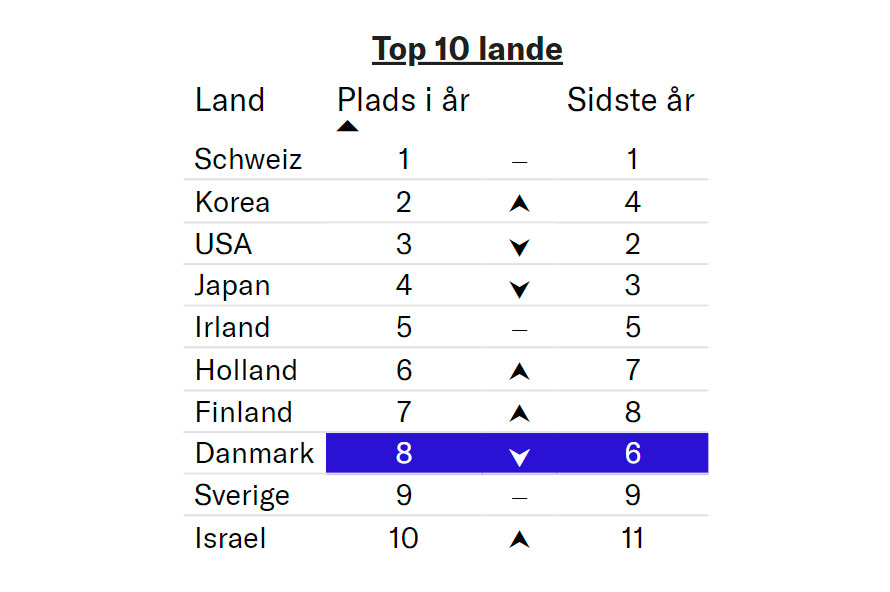 Hvis Danmark skal blive verdens bedste land at drive virksomhed i, så kræver det, at vores konkurrenceevne er i top. Dansk Erhvervs Konkurrenceevnebarometer, der måler på erhvervslivets rammevilkår og konkurrenceevne i et internationalt perspektiv, viser, at det siden sidste år er gået den gale vej, når det gælder erhvervslivets rammevilkår og Danmarks konkurrenceevne. Danmark ligger nu nummer 8, mens Schweiz i lighed med sidste år har den gule førertrøje på. Ud over Schweiz er det Korea, USA, Japan, Irland, Holland og Finland, der klarer sig bedre end Danmark.