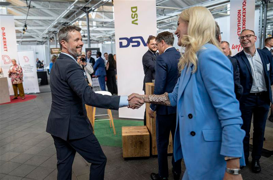 De fem nominerede til Dansk Erhverv-prisen 2022 havde alle en stand på dagen, hvor de fik beøsg af H.K.H. Kronprinsen og statsminister Mette Frederiksen. Her lægger H.K.H. vejen forbi Vestas, som var nomineret for sin Køreplan for Cirkularitet.