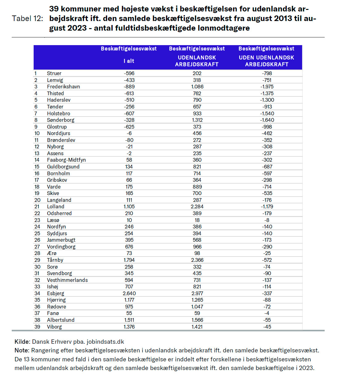 Struer, Lemvig, Tønder, Glostrup, Nyborg og Assens. Det er blot nogle af de 39 kommuner, som har nydt ekstra godt af udenlandsk arbejdskraft de seneste 10 år. Det viser en ny analyse fra Dansk Erhverv. I disse kommuner har væksten i beskæftigelsen for personer med udenlandsk statsborgerskab været højere end væksten i den samlede beskæftigelse.