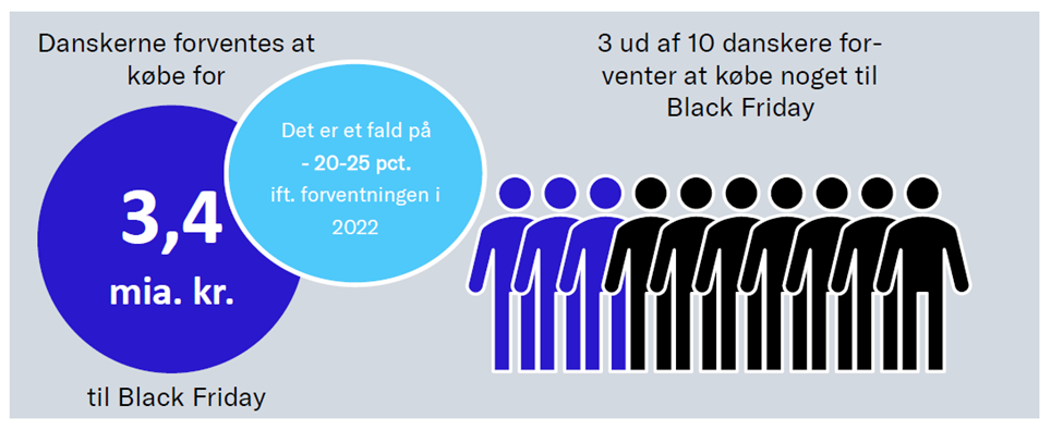 I år forventer 3 ud af 10 danskere (29 pct.) at købe noget på Black Friday. Det er lavere end sidste års forventninger op til Black Friday, hvor 36 pct. af danskerne forventede at købe. Danskerne forventer samlet at bruge 3,4 mia. kr. på årets Black Friday, hvilket er et fald på 20-25 pct., hvis vi sammenligner med forventningerne i 2022.