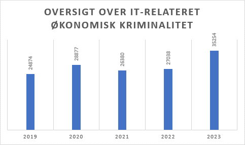 Siden 2019 er der sket en samlet stigning på ca. 42 procent. Ud af de 35.254 anmeldelser indenfor it-relateret økonomisk kriminalitet udgjorde kategorien samhandel ca. 35 procent af anmeldelserne, svarende til 12.155 anmeldelser. Derudover er anmeldelser om misbrug af kortoplysninger steget med ca. 70 procent fra 2022 til 2023, og er dermed den anden mest anmeldte kategori med 7.327 anmeldelser. Det rapporterede tab i telefonsvindelssager er opgjort til over 103 millioner kroner.