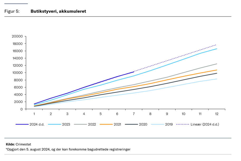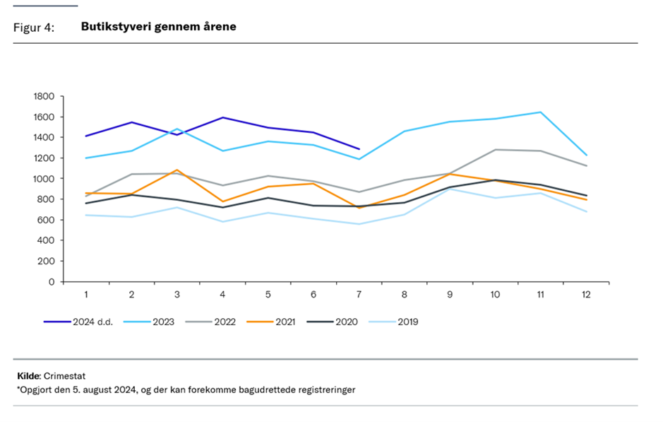 Vi er nu for alvor tilbage fra sommer, og den negative udvikling i butikstyverier fortsætter som tidligere forudset. April måned slog rekord med det højeste antal registrerede butikstyverier i 2024, og juni og juli forekommer som små solstråler i mørket, da der ses en lille nedgang i de to sommermåneder. Imidlertid skal man næppe lægge noget i det, da tendensen har været den samme - færre registreringer i sommermånederne – de foregående fem år.