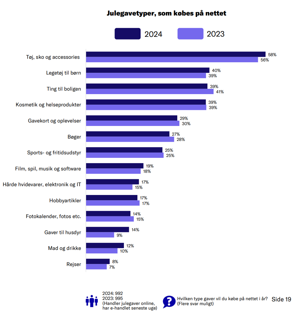Mange bløde pakker under træet: Tøj, sko og accessories er den mest populære gave, som onlinekunderne forventer at købe til julen 2024, uanset hvilken aldersgruppe de tilhører. Kosmetik og helseprodukter er også populære gaver blandt unge, singler, par og børnefamilier. Desuden er gaver til boligen en eftertragtet kategori. For børnefamilier, midaldrende og pensionister er legetøj til børn desuden en meget populær gave.