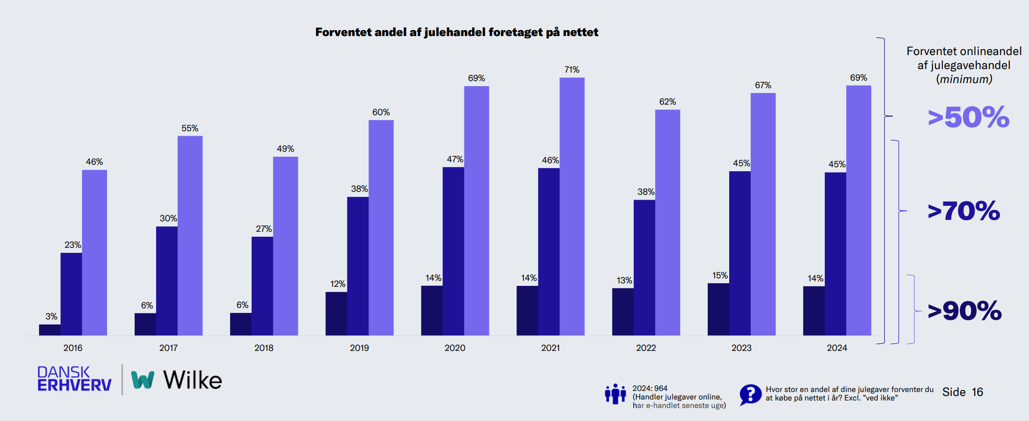 8 ud af 10 af onlineforbrugere forventer at købe julegaver på nettet i 2024, og cirka 7 ud af 10 forventer at købe mindst halvdelen af deres julegaver online. Det viser Dansk Erhvervs E-handelsanalyse.