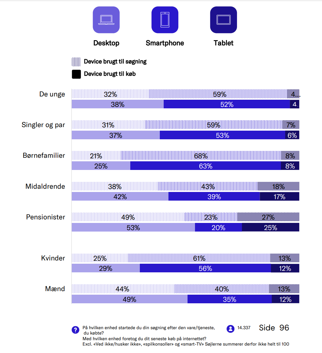 Bevægelsen fra desktop til smartphones ses i samtlige befolkningsgrupper. Selvom både de midaldrende og pensionisterne også er begyndt at flytte på mobilen, er det dog stadig de yngre, der oftest handler via telefon.