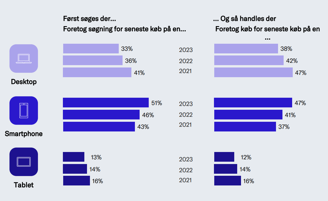 Babysam er langtfra alene om at opleve, at forbrugerne i stigende grad handler via telefonen. De seneste år er flere og flere handler flyttet fra computeren og ind på telefonen. Og i 2023 var for første gang flere, der gennemførte deres køb på smartphone end desktop. Det viser E-handelsanalysen 2023.